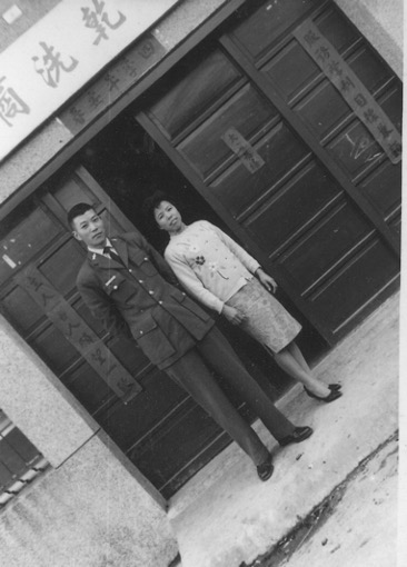 陳祥娟與先生陳耀法在洗衣店門口合影