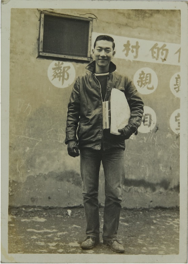 張培義攝於四四東村,背後牆面上有「敦親睦鄰、守望相助」的精神標語