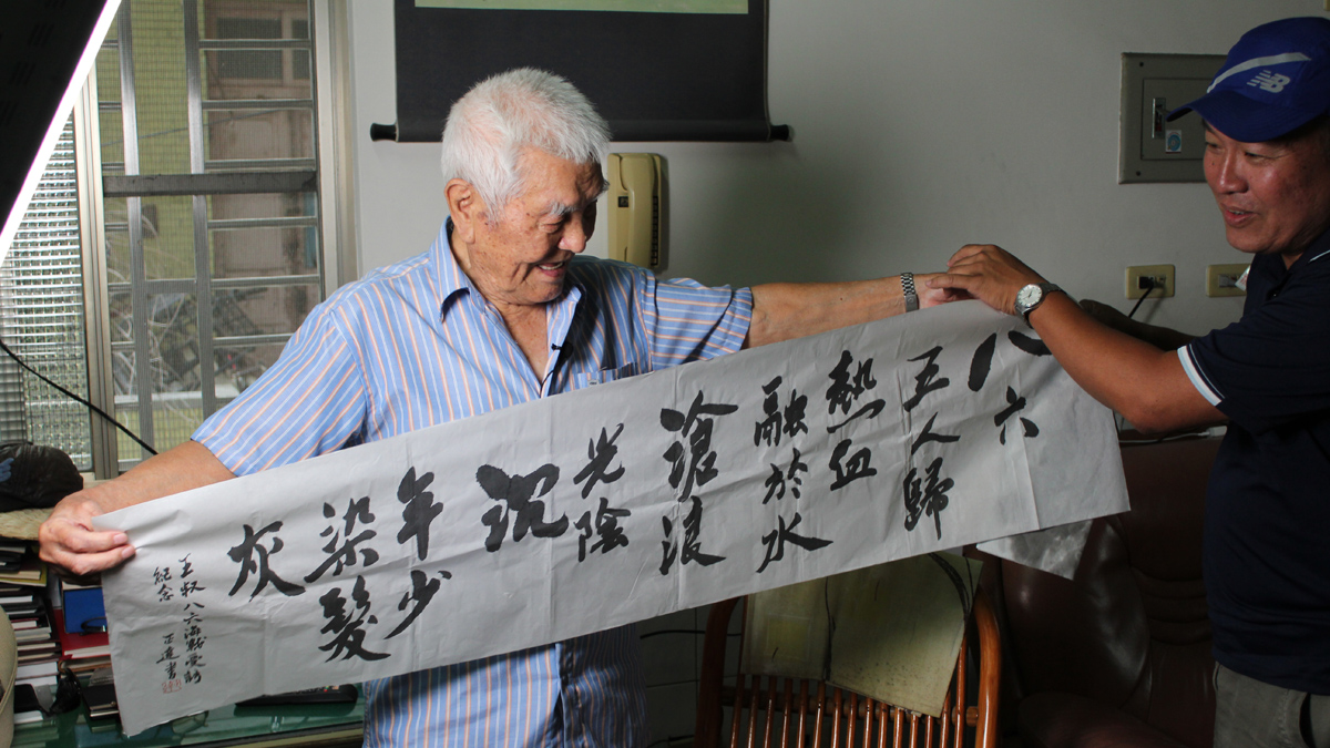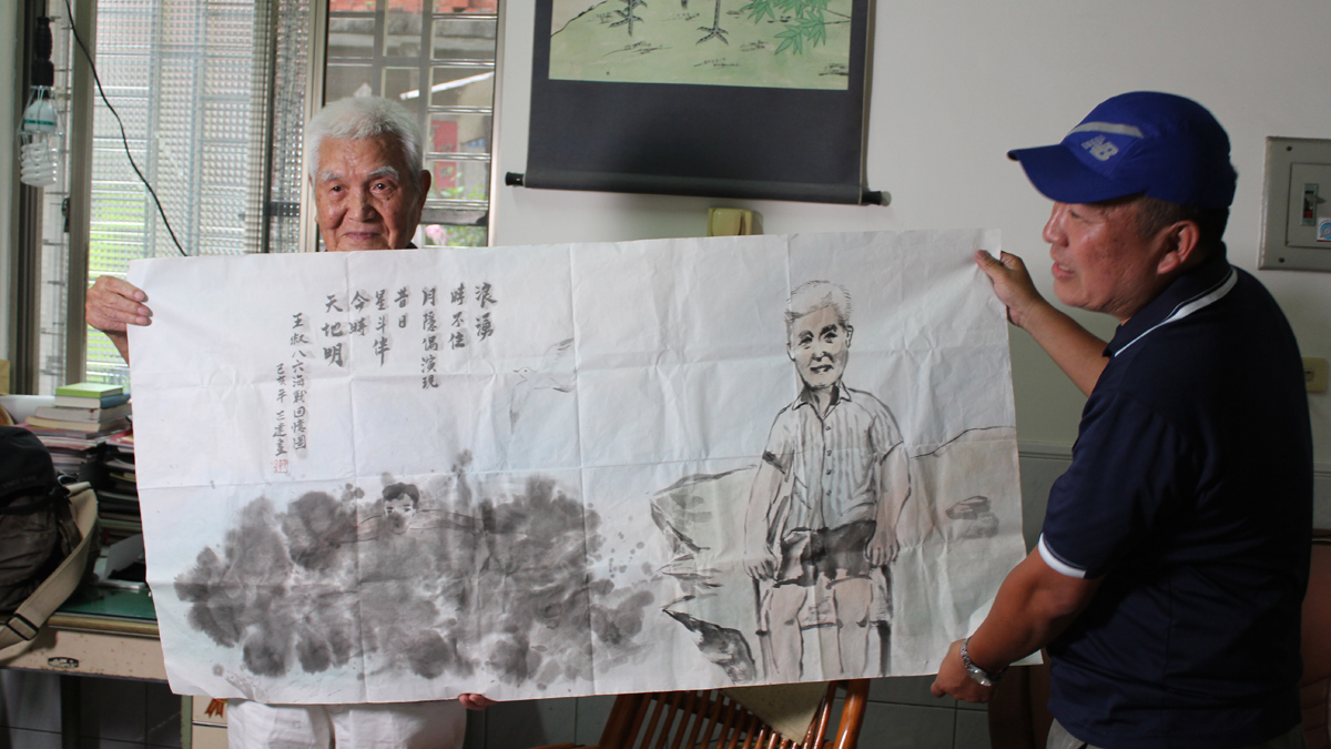 採訪這天,王茂信軍中同袍好友的兒子丁正達,特地從台中南下,拿了兩幅親手繪製的字畫送給他,一幅寫著:
