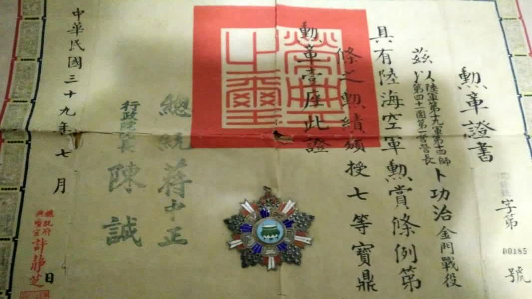卜功治於金門戰役立功,受頒寶鼎勳章與證書。