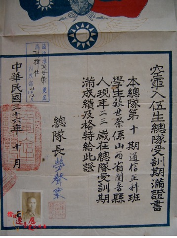 張健常父親張擇仕(舊名:張世榮)空軍入伍受訓期滿證書。(張健常提供)