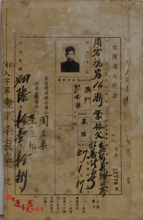 周宏沅在1954年(民46)從香港入境臺灣省的入境證。