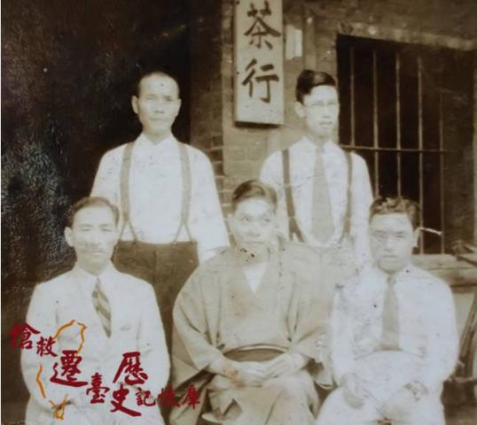 李朝舟(右)返台主持豐南商事株式會社重役會-與北川氏(左)合影 李朝舟(前排中)與李團居(右).王玉慶(後左)攝於豐南茶行