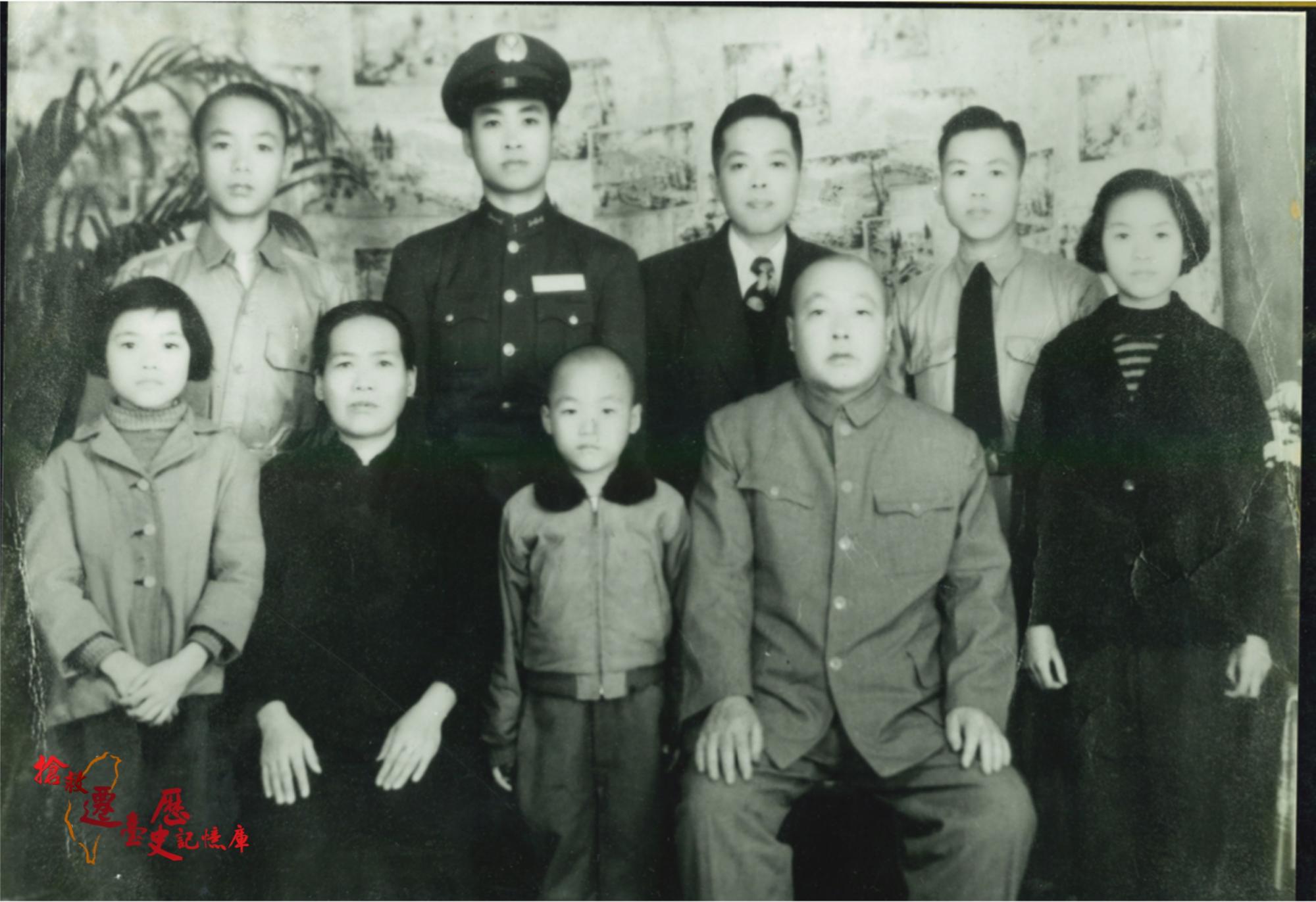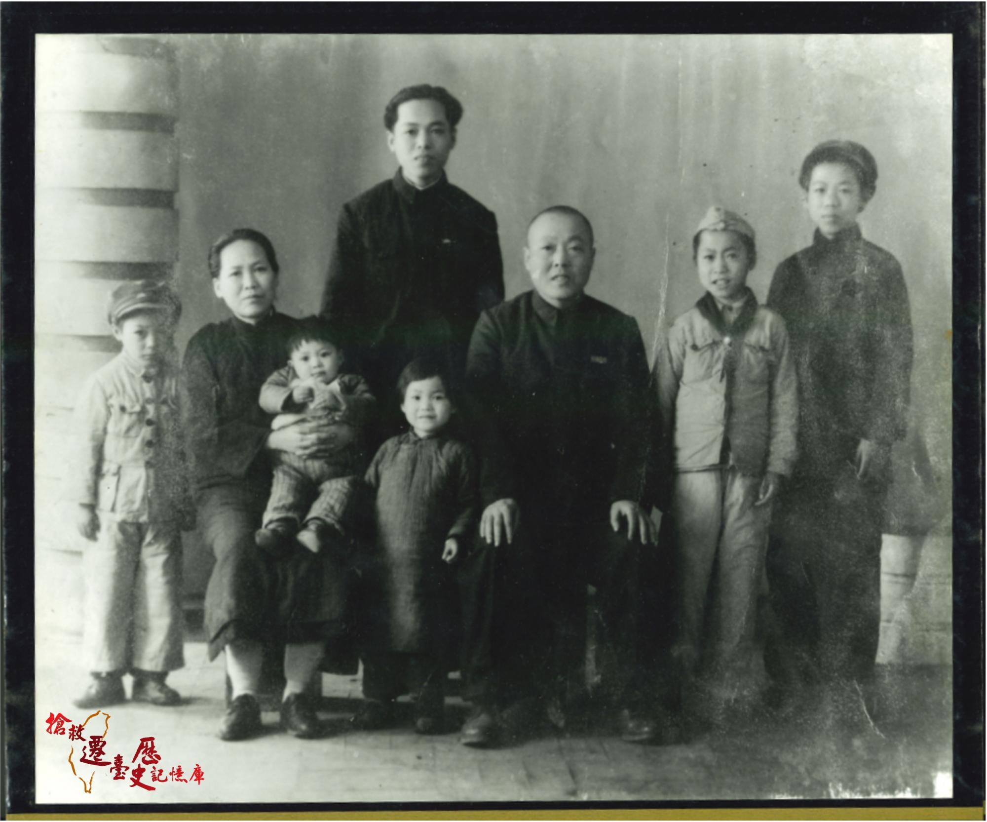 1946年(民35),貴陽相館一家八口的全家福,右起二哥李富臣、李富城、爸爸李寶珍、大哥李富森(站立者)、